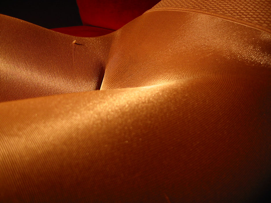 Des formes abstraites émergent des décors ambigus. Tout ce mélange dans un curieux processus de création, très intime et ludique. Très érotique aussi surtout. Le regard est intéressant et original. Le collant donne une unité de mesure, une universalité dans le traitement de l’objet qui devient irréel, entre réalité et fantasme.